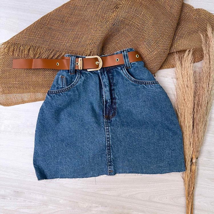 : jeans, cós alto e sem lycra com cinto.